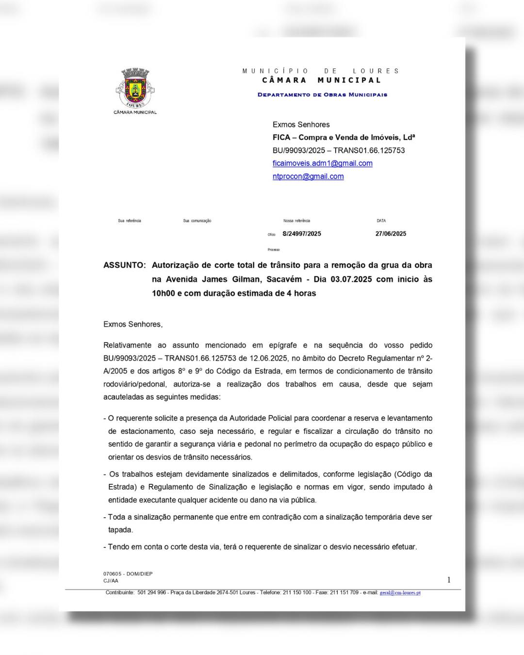 ⚠️INFORMAÇÃO⚠️ | CÂMARA MUNICIPAL DE LOURES | CORTE DE TRÂNSITO | AV. JAMES GILMAN | SACAVÉM | 3 DE JULHO | A PARTIR DAS 10H00