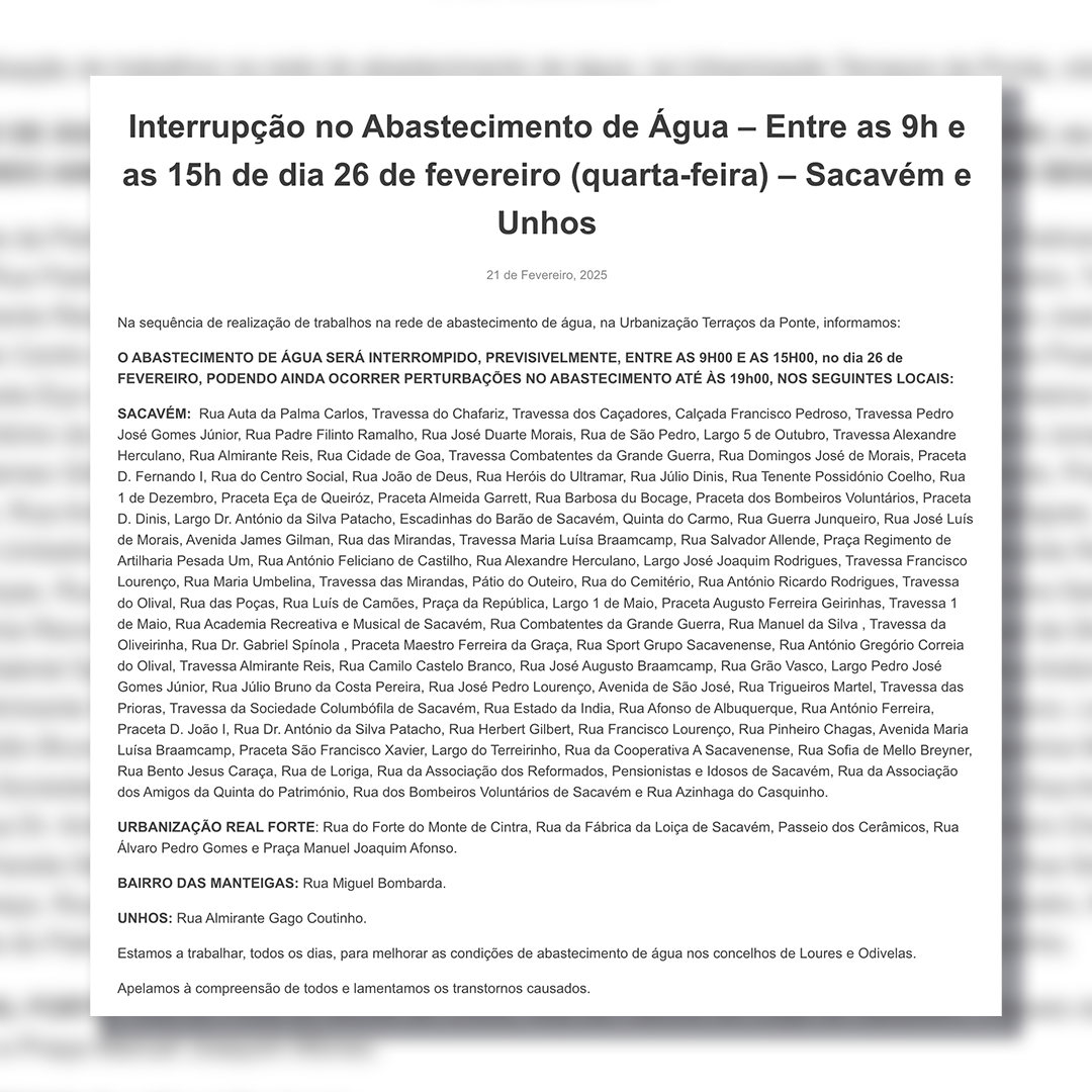 #umajuntaproximadaspessoas #uniaodasfreguesiasdesacavemepriorvelho #ufspv #ufsacavemepriorvelho #sacavem #priorvelho #municipiodeloures #concelhodeloures #loures #aviso #simar #interrupcaonoabastecimentodeagua #27defevereiro