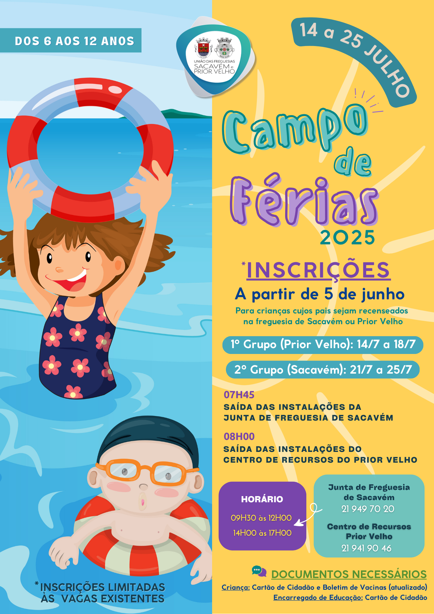 A partir do dia 5 de junho, a União das Freguesias de Sacavém e Prior Velho irá dar início às inscrições para o “Campo de Férias”, a realizar de 14 a 25 de julho.