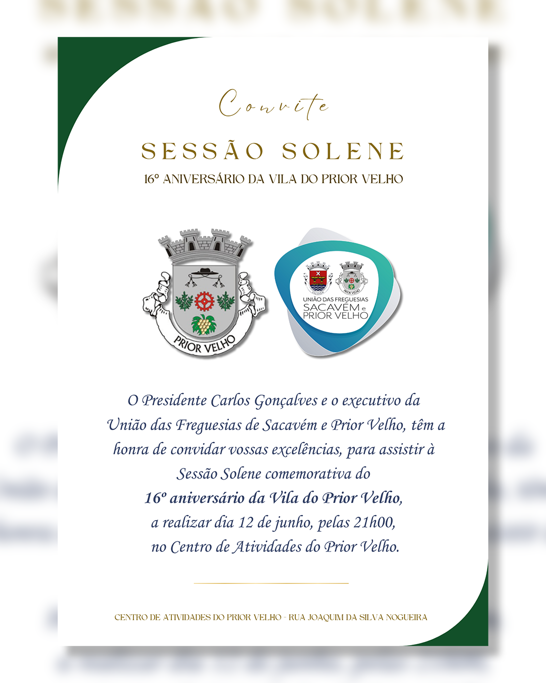 CONVITE À POPULAÇÃO | SESSÃO SOLENE | 16º ANIVERSÁRIO DA VILA DO PRIOR VELHO | 12 DE JUNHO | 21H00 | CENTRO DE ATIVIDADES DO PRIOR VELHO