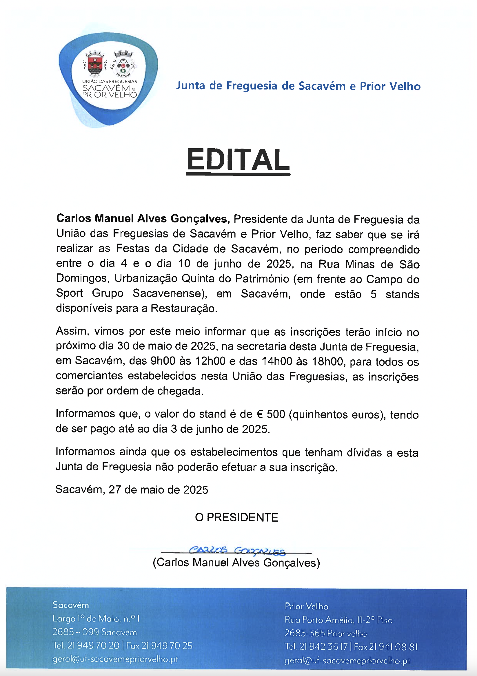 EDITAL | INSCRIÇÕES | STANDS RESTAURAÇÃO | FESTAS DA CIDADE DE SACAVÉM 2025