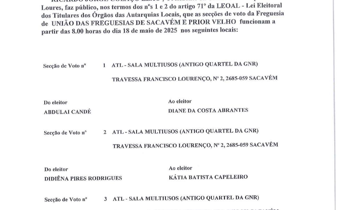 EDITAL | INSTALAÇÃO DA ASSEMBLEIA DE FREGUESIA DA UNIÃO DAS FREGUESIAS DE SACAVÉM E PRIOR VELHO | 30 DE OUTUBRO | 21H00 | CENTRO DE ATIVIDADES DO PRIOR VELHO