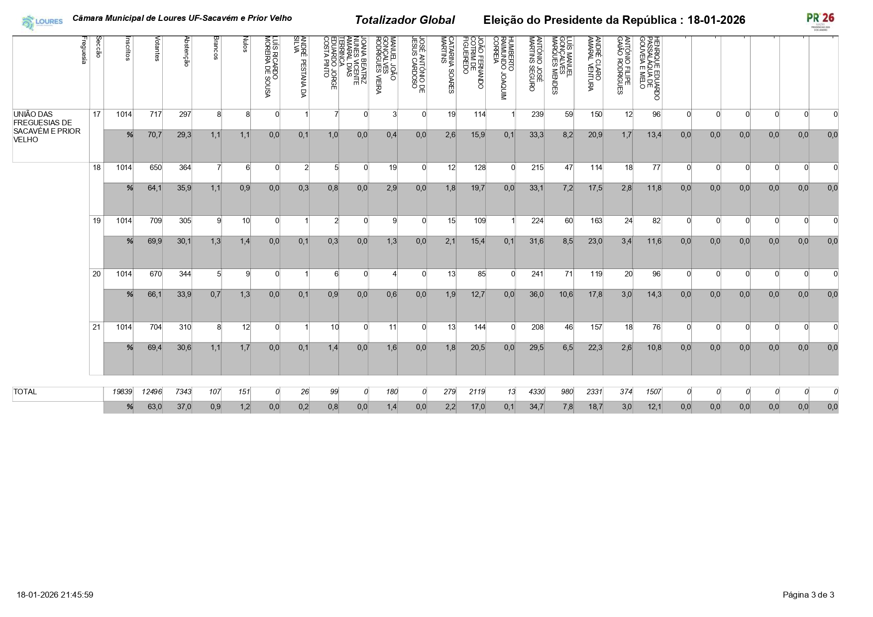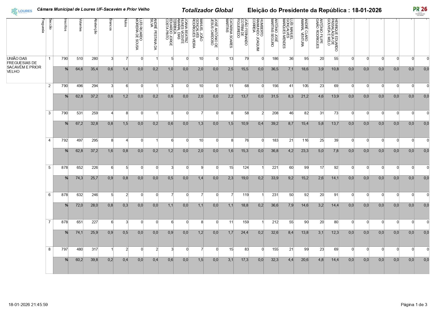 Conheça aqui o mapa de resultados na União das Freguesias de Sacavém e Prior Velho, para a Eleição do Presidente da República, no dia 18 de janeiro de 2026.